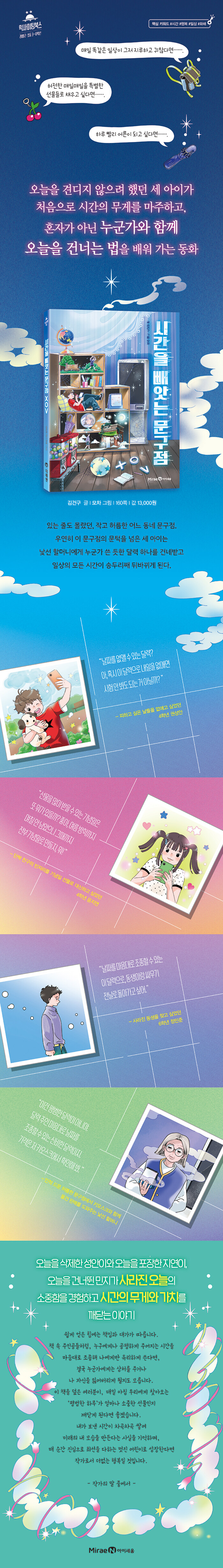 오늘이라는 하루를 살아가는 가장 큰 힘을 이야기하는 작품 《시간을 빼앗는 문구점 XOV》를 통해, 많은 어린이들이 자신이 보내는 시간이 차곡차곡 쌓여 미래의 자신을 만든다는 사실을 기억하고, 매 순간 열심히 오늘을 살아가는 힘을 얻게 되길 바랍니다.