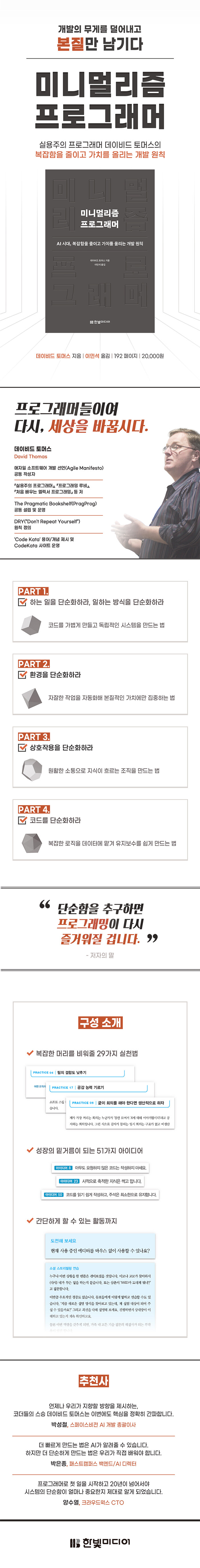 AI가 코드를 대신 작성하는 시대입니다. 하지만 아이러니하게도 소프트웨어는 그 어느 때보다 비대하고 복잡해졌습니다. ‘더 빠르게, 더 많이’를 외치는 세상에서, 전설적인 명저 『실용주의 프로그래머』의 저자 데이비드 토머스는 신작 『미니멀리즘 프로그래머』를 통해 개발자가 나아가야 할 정반대의 길, '단순함'을 제시합니다.