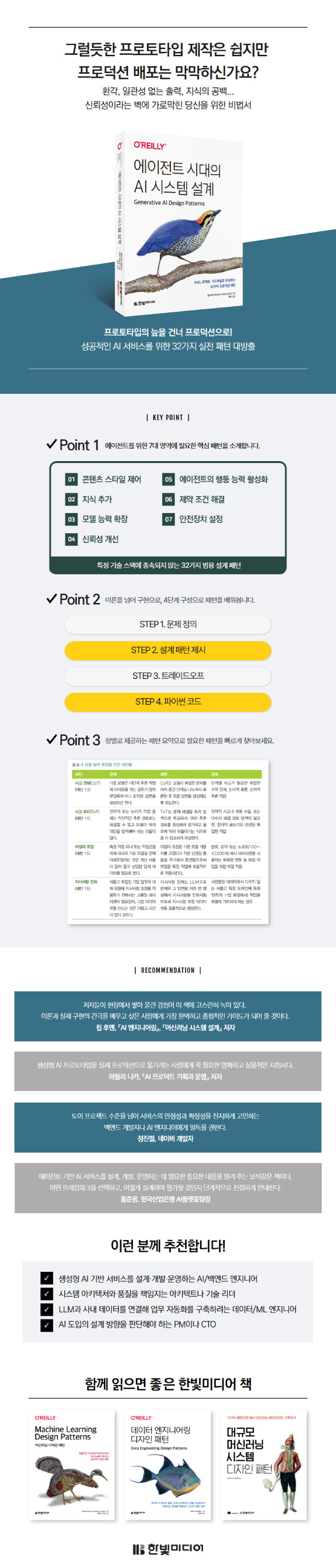 이 책은 콘텐츠 제어, RAG 고도화, 추론 확장, 다중 에이전트 협업, 비용·지연시간 최적화, 안전 가드레일까지 7개 영역을 관통하는 32가지 설계 패턴을 담았습니다. 각 패턴은 문제 정의, 해법, 트레이드오프, 예제 코드로 구성되어 있으며 특정 모델이나 프레임워크에 종속되지 않습니다. 기술 스택이 교체되어도 유효한 설계 원칙을 손에 쥐고 싶다면 이 책이 가장 확실한 출발점이 될 것입니다.