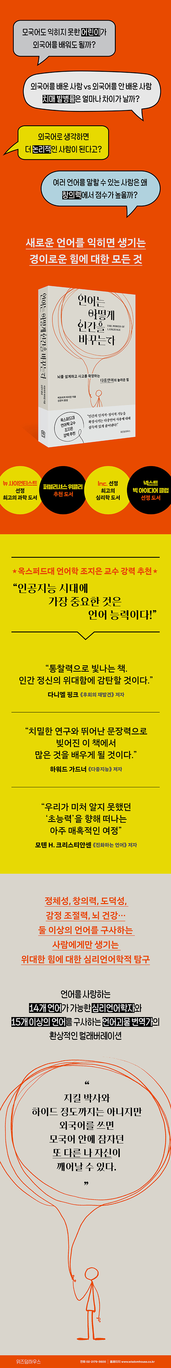 저자는 우리는 본래 여러 언어를 구사할 수 있는 능력을 모두 갖고 있다고 말한다. 책에서 소개되는 여러 형태의 언어와 마음의 상호작용, 그로 인한 개인의 변화, 또 언어가 사회에 미치는 영향력과 파급 효과를 보고 나면, 우리는 당장 지금까지 있는지도 몰랐던 자신의 잠재력을 꺼내고 싶은 마음이 들 것이다.