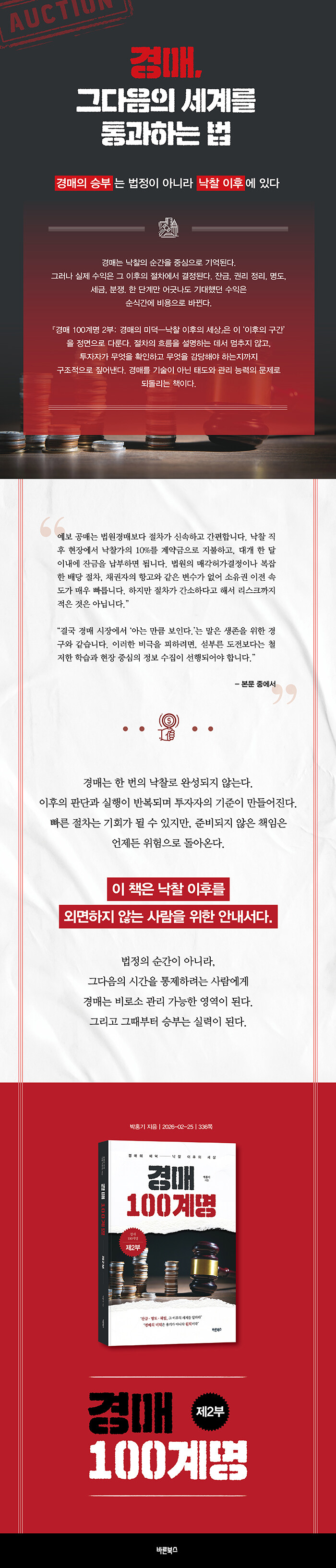 『경매 100계명 제2부: 경매의 미덕—낙찰 이후의 세상』은 낙찰의 순간을 끝이 아니라 책임의 출발점으로 규정한다. 대부분의 경매서가 입찰가 계산과 낙찰 요령에 머무를 때, 이 책은 잔금·배당·등기·인도명령·명도라는 낙찰 이후의 실제 전장을 정면으로 다룬다. “싸게 받았다.”는 자기만족이 어떻게 손실로 바뀌는지, 그리고 그 손실을 막는 유일한 방법이 무엇인지를 구체적 절차와 원칙으로 제시한다.