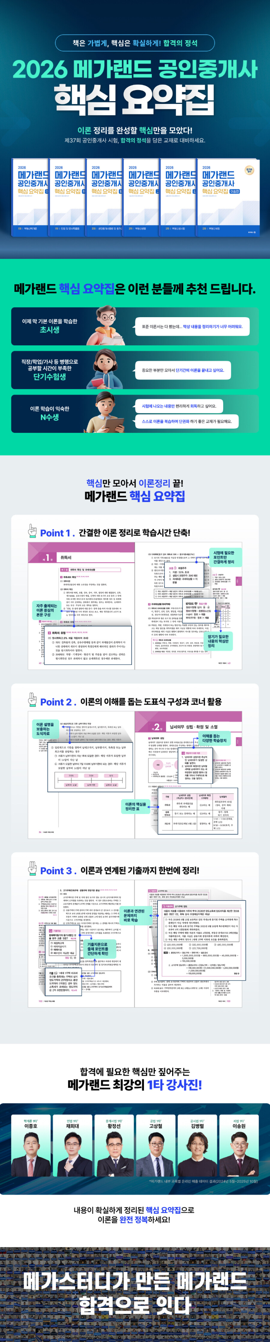 메가랜드가 방대한 기본서를 핵심 위주로 재구성해 공인중개사 시험 필수 이론만을 담았다. 그림과 도식, 기출문제 중심 구성으로 짧은 시간 안에 이론 정리와 실전 감각을 함께 완성한다.
