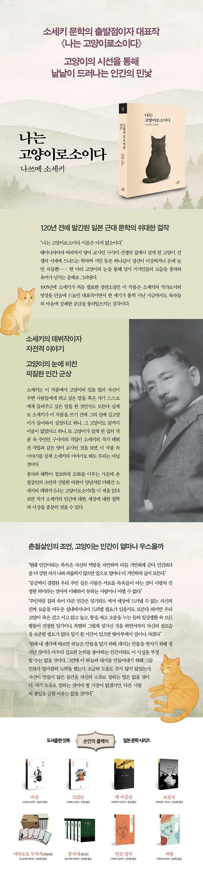 태어나자마자 버려져서 영어 교사인 구샤미 선생의 집에서 살게 된 고양이. 선생의 서재에 드나드는 학자며 시인 등은 하나같이 정신이 이상하거나 돈에 눈먼 자들뿐……. 한 마리 고양이의 눈을 통해 당시 지식인들의 모습을 풍자와 유머가 넘치는 문체로 그려낸다.