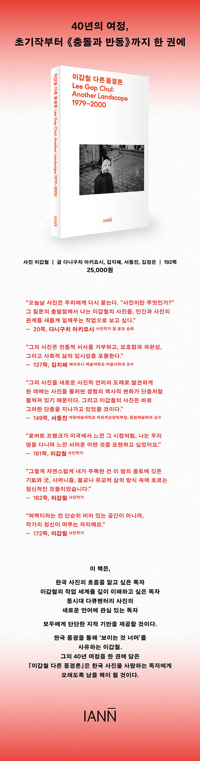이 책은 한 작가의 작업을 기록한 자료집을 넘어서, 한국 사진이 시대와 사회, 그리고 무의식의 감각을 어떻게 포착해 왔는지를 보여주는 중요한 참조점이 된다. 이갑철의 사진 앞에서 우리는 ‘풍경’이란 단어가 단순한 시각적 대상이 아니라, 역사와 감정, 기억과 존재의 결이 겹겹이 쌓여 나타나는 하나의 살아 있는 장(field)임을 자연스레 깨닫게 된다.