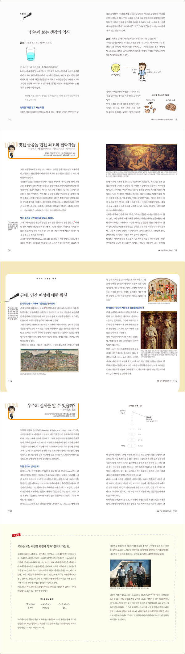 생각의 역사인 철학은 역사와 미술과 통하며, 음악과 통하고, 경제와도 통한다. 이를테면 고대 그리스 철학을 이해하면, 고대 그리스 조각 「라오콘과 그 아들들」에서 라오콘이 왜 뱀에 물려죽는 고통 속에서도 영혼의 위대함을 보여주는지를 알 수 있다. 현대 철학을 알게 되면 르네 마그리트의 그림 「이것은 파이프가 아니다」의 진정한 의미를 이해할 수 있으며, 잭슨 폴락이 물감 뿌리기로 그린 그림 「넘버5」가 왜 천문학적 금액에 거래될 정도로 환영을 받게 되었는지를 실감할 수 있다. ― 머리말 6쪽 중에서