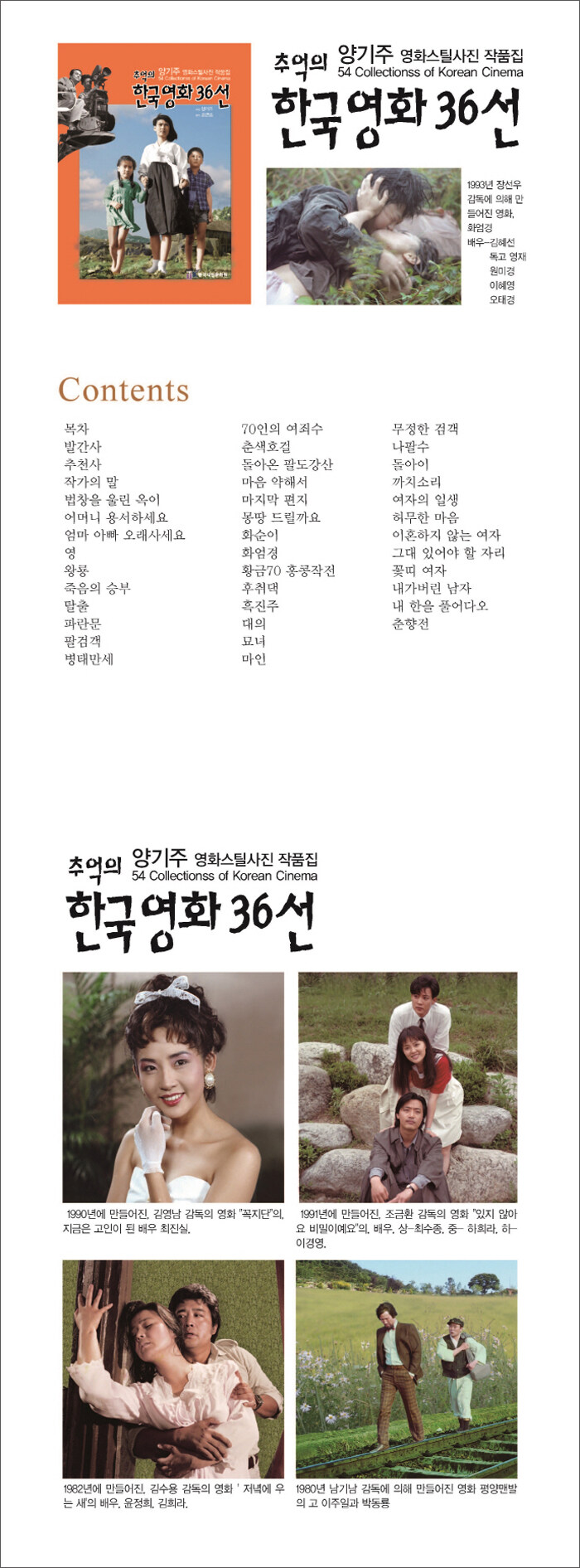 양기주 영화스틸사진 작품집. 은막의 스타들 그리고 한국영화의 흐름을 한눈에 조명해 볼 수 있는 작품집이다. 우리나라 최초로 영화 257선을 총 여섯 권으로 나누어 제작연도, 감독과 주연 및 촬영기사 그리고 영화 줄거리와 해설을 담아 구성했다.