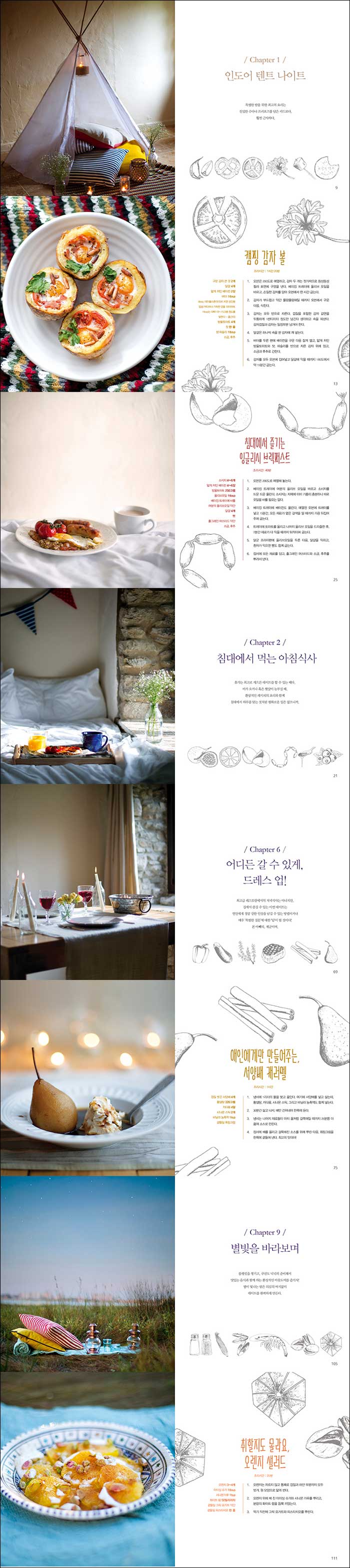 몇 가지 안 되는 간단한 재료로 짧은 시간에 만드는, 그러나 맛이나 모양에 있어서만큼은 연인의 얼굴에 절로 미소를 띠게 만드는 이 요리들은 프로포즈, 둘만의 휴가, 피크닉, 집에서 밤새워 영화를 볼 때 등 모두 9가지 로맨틱한 상황에 맞게 구성되어 있다.