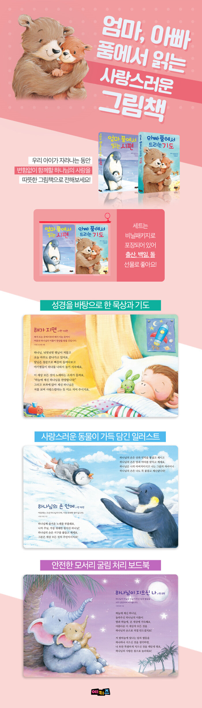 엄마의 품에 안긴 채 읽는 시편 묵상 그림책이다. 잠자리에서 우리 아이를 꼭 안고 이 책을 읽어 주자. 시편에 담긴 아름다운 시와 노래들이 우리 아이의 마음에 깊이 새겨질 것이다. 또한 아이들이 사랑에 빠질 수밖에 없는 사랑스러운 동물 일러스트가 가득하다.