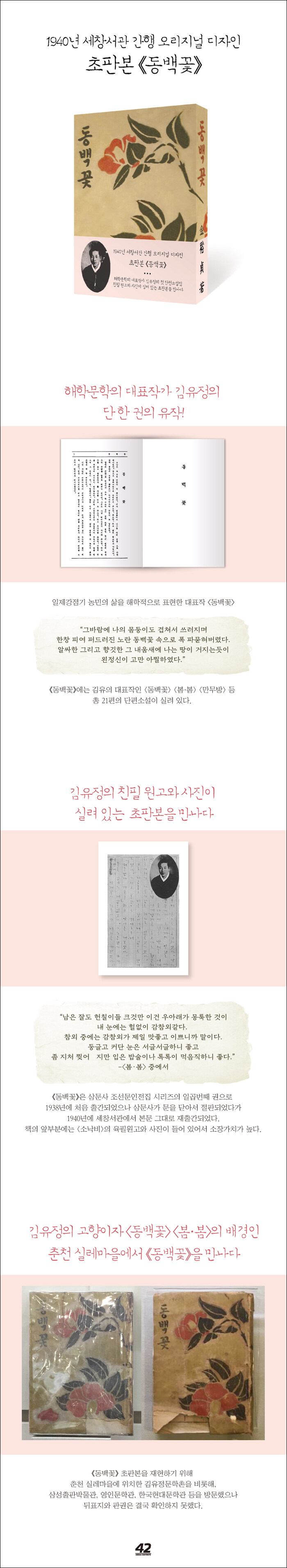 김유정의 단편소설집 <동백꽃>이 1940년 세창서관에서 간행한 오리지널 디자인으로 복간되었다. <동백꽃>은 삼문사 조선문인전집 시리즈의 일곱 번째 권으로 1938년에 처음 출간되었으나 삼문사가 문을 닫은 후에 본문 그대로 표지를 바꾼 채 1940년에 세창서관에서 출간되었다.