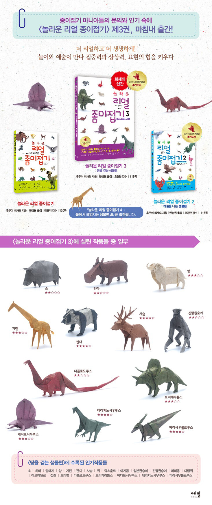 어린이들의 놀이 정도로 인식되고 있는 국내 종이접기 시장에서, <놀라운 리얼 종이접기>는 좀 더 난이도가 있는 책을 찾고 있는 어른들과 아이들에게 꾸준한 사랑을 받고 있는 종이접기 시리즈다. 이번 3권에서는 하마, 땅돼지, 아르마딜로, 전갈 등 땅을 걷는 생물들을 만날 수 있다.