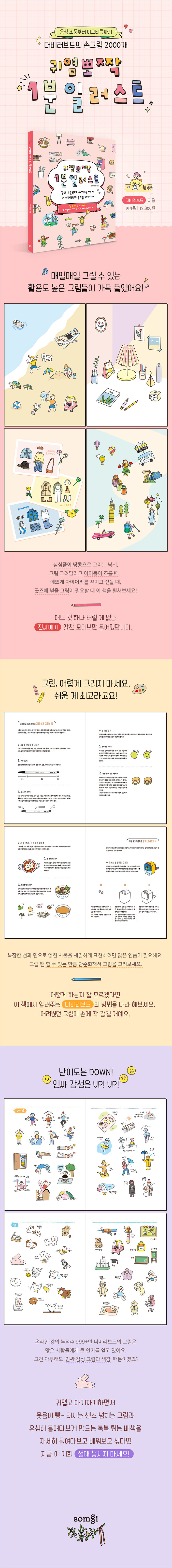 온라인 취미 클래스 ‘비스킷’에서 일러스트 수업을 진행하는 인기 강사 더비러브드의 귀여운 그림이 2000가지 이상 가득 들어있는 일러스트 책이다. 복잡한 사물도 단숨에 휘리릭 그릴 수 있는 노하우와 스스로 따라 그려보며 그림의 감을 익힐 수 있다.