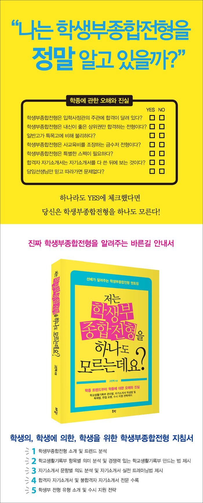 제가 탈락한 것은 합리적인 결과였습니다. 저는 학생부종합전형에 대해 하나도 몰랐던 것입니다. 학생부종합전형의 본질을 제대로 이해하지 못했고, 그로 인해 잘못된 방향으로 3년간 열심히 달렸다는 것을 깨달았습니다. 억울했습니다. 엉뚱한 방향으로 땀 흘리며 달리는 동안 누구 하나도 저에게 ‘너는 학생부종합전형에 대해 잘 모르고 있어. 네가 가는 방향은 잘못됐어.’라고 말해주지 않았습니다. 소위 금수저라고 불리는 친구들은 고액의 컨설팅을 받고, 특목고·자사고 학생들은 학교의 정보력과 도움으로 생활기록부와 자기소개서를 A부터 Z까지 관리받을 텐데 저를 비롯한 평범한 가정의 평범한 일반고 학생들은 그렇지 못하다는 것도 화가 났습니다. 그래서 직접 학생부종합전형을 공부해서 저와 같은 후배들에게 컨설턴트가 되어주고자 마음먹었습니다. -p.5 「여는 말」