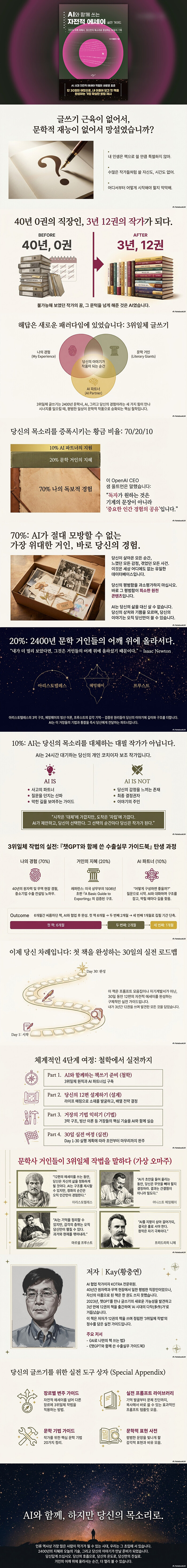 3위일체 글쓰기는 이 책의 핵심 철학이다. 2400년 문학사, AI, 그리고 당신의 경험이라는 세 가지 힘이 만나 시너지를 일으킬 때, 평범한 일상이 문학적 작품으로 승화된다.