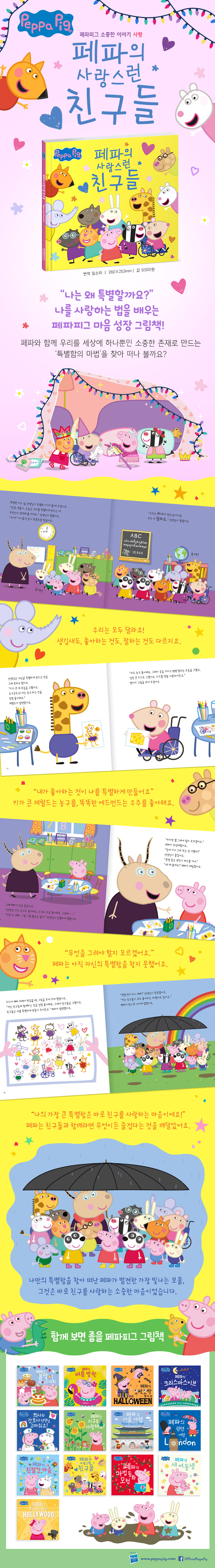 출간 직후 베스트셀러가 된 <페파의 서울 여행>에 이어 이번 신간은 아이들이 또래 관계 속에서 자신의 정체성을 찾고 서로의 다름을 인정하는 소중한 교훈을 담고 있습니다. <페파의 소중한 이야기> 시리즈는 사랑, 동화, 친절, 동생 등 다양한 주제로 아이들의 마음을 성장시키는 내용으로 구성된 시리즈입니다. <페파의 사랑스런 친구들>은 페파의 친구들을 사랑하는 마음이 가득 담긴 그림책입니다. 책을 읽으며 페파와 함께 사랑의 가치와 나를 특별하게 만드는 것이 무엇인지를 생각해 보세요.
