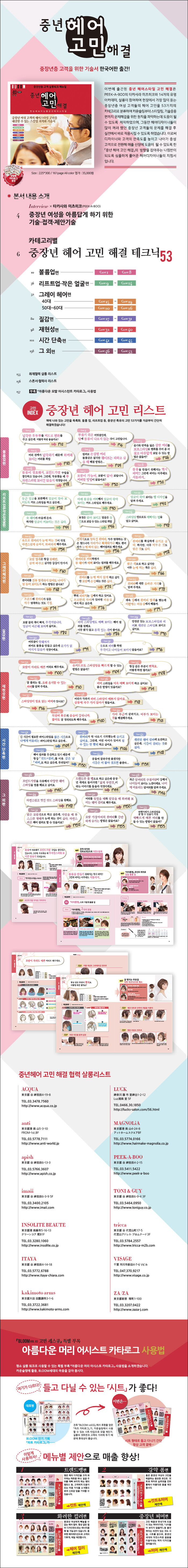 PEEK-A-BOO의 타카사라 미츠히코와 14개의 유명 아카데미, 살롱이 참여하여 현장에서 가장 많이 듣는 중장년층 여성 고객들의 헤어 고민을 53가지의 카테고리로 분류하여 카운슬링부터 스타일링, 기술응용 편까지 문제해결을 위한 원칙을 파악하는데 도움이 될 수 있도록 제작하였다.