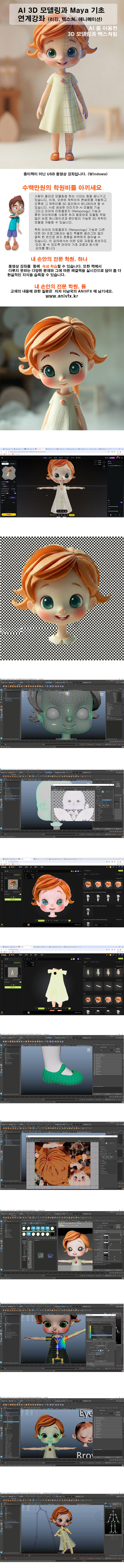 AI로 생성한 이미지와 AI 모델링 기술 그리고 마야의 리토폴로지(Retopology) 기능과 휴먼 아이케이를 사용한 워크 플로어로 바로 애니메이션과 렌더링이 가능한 3D 캐릭터 모델을 개발할 수 있다. 이 모든 과정을 초보자도 따라 할 수 있도록 마야의 기초 과정과 동시에 강의한다.