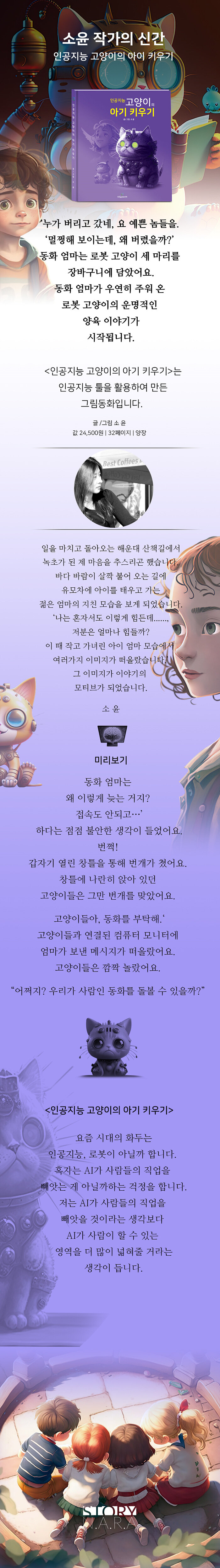 고양이 가족은 고민고민하며 고생고생하며 동화를 키워요. 인공지능 고양이들이 동화를 잘 키울 수 있을까요? 아기고양이 쭈니의 표정이 심상치 않아요.