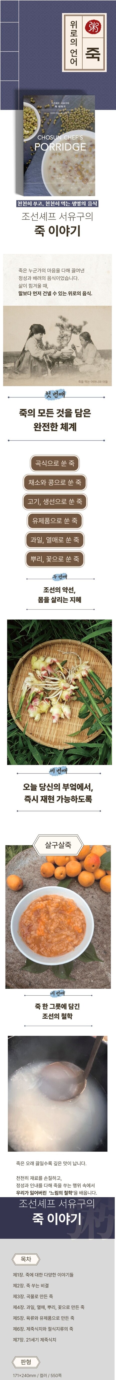 『조선셰프 서유구의 죽 이야기』는 조선 후기 실학자 서유구(徐有?, 1764?1845)의 『임원경제지(林園經濟志)』 중 음식 분야를 다룬 『정조지(鼎俎志)』 권2 전오지류(煎熬之類)에 수록된 죽(粥) 편을 원문 번역과 현대적 해설을 통해 복원한 책이다. 이 책은 단순한 조리서가 아니라, 죽이라는 음식에 담긴 역사·문화·철학·의학적 의미를 종합적으로 조명한다.서유구는 죽을 밥과 명확히 구분되는 조리 체계로 이해하고, 곡물·과일·열매·뿌리·꽃·육류·유제품 등 다양한 재료를 활용한 40여 종의 죽 조리법을 체계적으로 기록하였다. 『정조지』에 수록된 죽은 단순한 환자식이나 빈곤의 음식이 아니라, 소화와 흡수가 뛰어난 주식이자 약식동원(藥食同源)의 사상을 구현한 건강식으로 인식되었다. 본서는 이러한 기록을 바탕으로, 각 죽의 재료 구성과 조리법, 효능과 용도를 현대인의 식생활에 맞게 해석한다.또한 이 책은 죽이 지녀온 사회적 의미에도 주목한다. 효도와 봉양, 공동체적 나눔, 치유와 회복의 상징으로서 죽이 한국인의 삶 속에서 어떤 역할을 해왔는지를 다양한 이야기와 사례를 통해 풀어낸다. 더 나아가 현대의 기능성 식품과 즉석죽 중심의 식문화 속에서, 전통 죽이 지닌 섬세한 조리 기술과 정성의 가치, 그리고 지속 가능한 건강 관리 방식으로서의 가능성을 제시한다.『조선셰프 서유구의 죽 이야기』는 전통 음식 문화에 관심 있는 일반 독자뿐 아니라, 요리 연구자, 식문화 종사자, 건강과 식생활에 관심 있는 독자에게 한국 전통 죽의 깊이와 확장성을 전달하는 교양서이자 실천적 참고서이다.