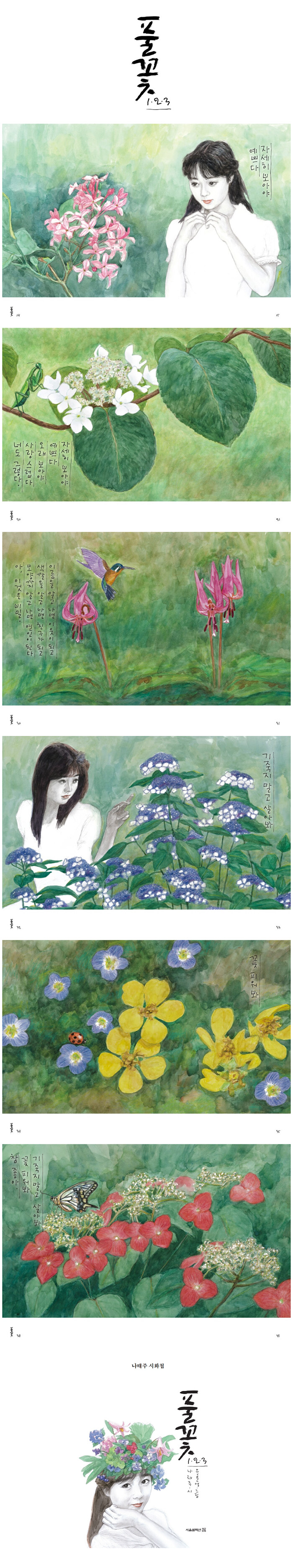 나태주의 대표 연작시 「풀꽃 1·2·3」을 한 권에 담은 첫 시화집이다. 많은 독자들이 「풀꽃」을 "자세히 보아야 예쁘다"로 시작되는 짧은 시 한 편으로 기억하지만, 사실 이 작품은 세 편으로 이루어진 연작시다. 이 책은 그 연작 전체를 한 권에 담아 「풀꽃」의 흐름과 의미를 온전히 감상할 수 있도록 구성했다.