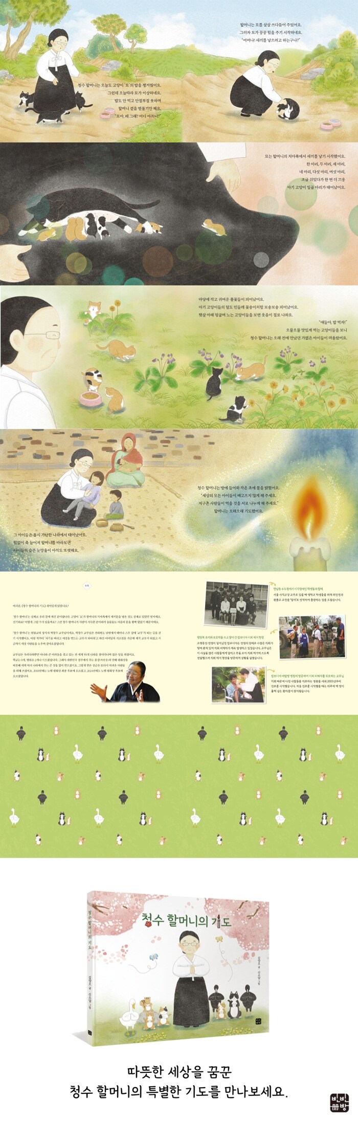 아프고 외로운 생명을 쉬이 지나치지 못하는 청수 할머니의 이야기를 담은 그림책이다. 들고양이가 청수 할머니의 치마폭에 새끼를 낳는 장면으로 시작하는 그림책은 이들의 일상을 따라가며 전 세계에 가난하고 어려운 사람을 위해 기도하는 청수 할머니의 모습을 아기자기한 그림으로 담아냈다.