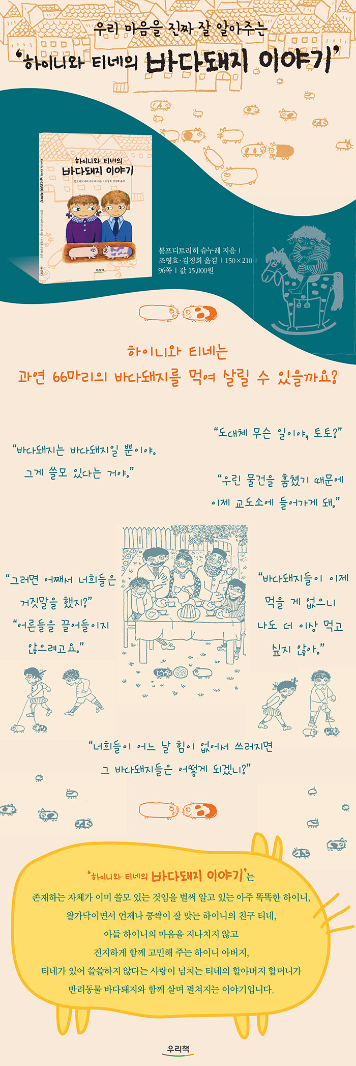 바다돼지와 함께한 하이니와 티네의 하루는 기쁨에서 고민으로 이어진다. 늘어나는 생명 앞에서 아이들은 책임을 배운다. 돌봄과 선택의 의미를 어린이의 시선으로 담아낸 이야기다.