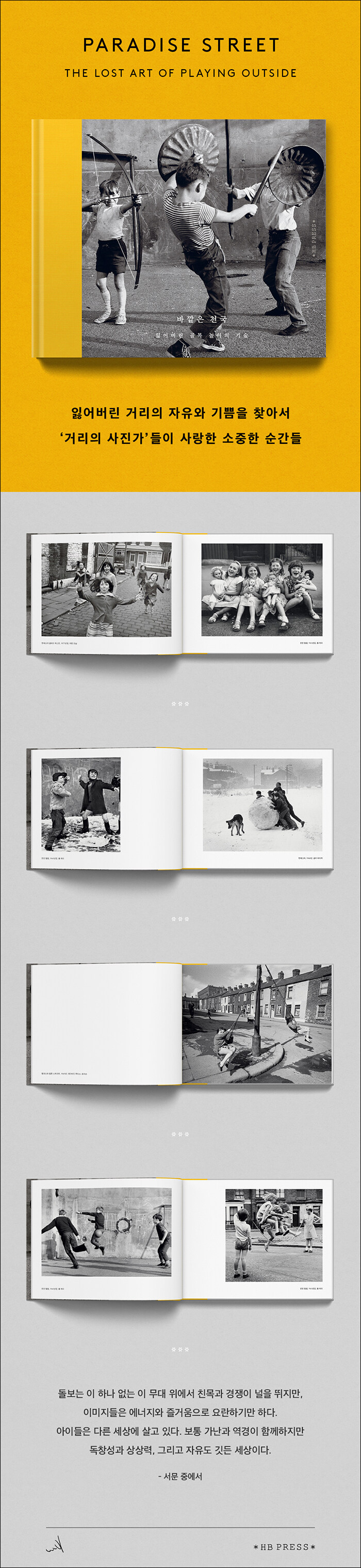 50년 전, 아마도 30년 전쯤의 아이들에게 거리와 골목은 호기심과 모험으로 가득한 곳이었다. 아이들이 과학 기술에 홀리거나 밖에 혼자 나가 놀지 못하는 오늘날, '밖에서 놀기'는 더 이상 흔한 일이 아니다. 주요 거리 사진작가들이 촬영한 이 책의 이미지들은 과거의 자유에 대한 즐거우면서도 아련한 기록이다.