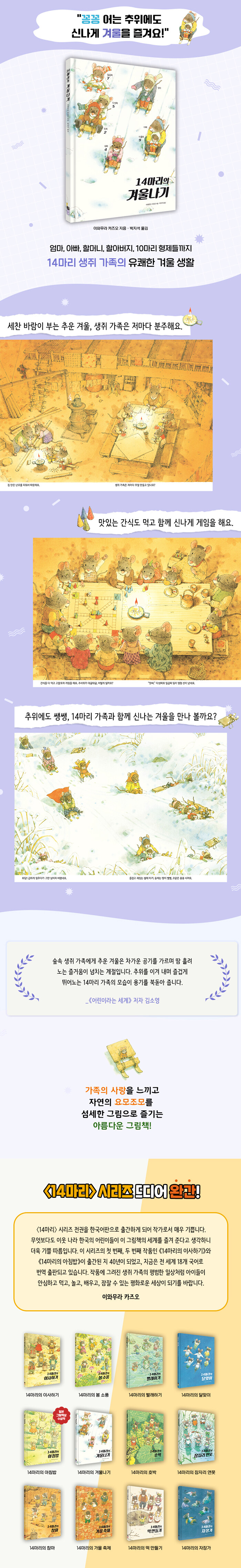 ‘이사하기, 봄 소풍, 빨래하기, 달맞이, 아침밥’에 이은 일본의 대표적인 그림책 작가 이와무라 카즈오의 14마리 시리즈 그림책이다. <14마리의 겨울나기>는 14마리 생쥐 가족의 겨울 생활을 섬세하고 아름다운 그림으로 그린 그림책이다.
