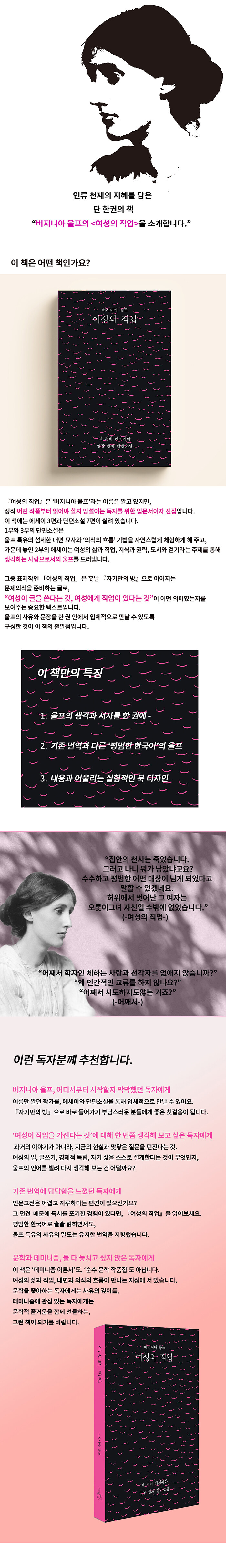 이처럼 『여성의 직업』은 한 권 안에 '소설과 에세이', '방 안의 사유와 거리 위의 시선', 그리고 '여성의 삶과 글쓰기'라는 여러 축을 함께 담아낸다. 버지니아 울프의 전작을 이미 읽어 온 독자에게는 그의 사유와 기법을 다시 정리할 수 있는 작은 선집이, 처음으로 울프를 읽어 보려는 독자에게는 부담 없이 도전할 수 있는 첫 책이 될 것이다.