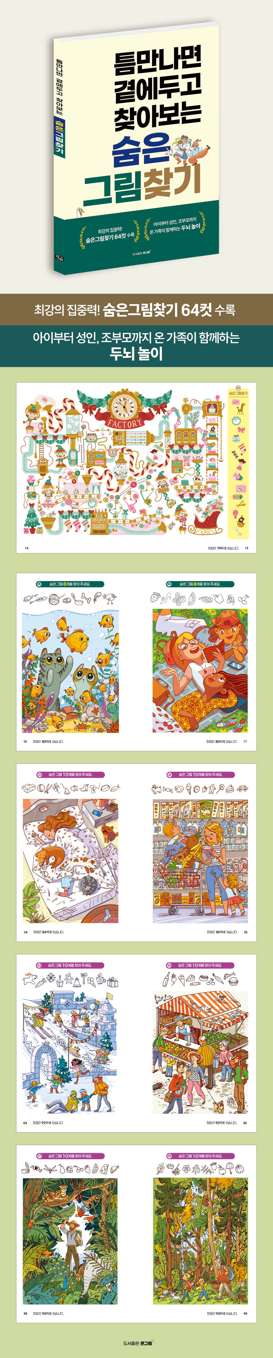 숨은그림찾기는 집중력과 관찰력, 기억력을 고루 자극하는 두뇌 활동이다. 그림을 천천히 탐색하며 긴장을 풀고, 낱말퍼즐과 함께 활용해 언어와 시각 인지를 균형 있게 단련하도록 구성했다. 여가 시간에 부담 없이 즐기는 두뇌 운동서다.