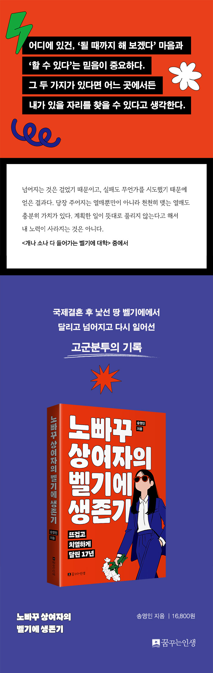 17년 세월이 책 한 권에 담길 리 없다. 생략된 사건과 사정이 많을 테다. 그러나 생을 향한 한 사람의 성실과 열정을 엿보기엔 이것으로도 충분하다. 말보단 행동으로 삶을 꾸려 가는 이 유쾌 상쾌 통쾌한 여정이, 우울과 주눅으로 움츠러든 이들에게 닿기를 바란다. 노빠꾸 상여자의 이야기가 각자의 자리에서 다시 한 번 마음을 다잡을 용기와 힘이 되어 줄 것이다.