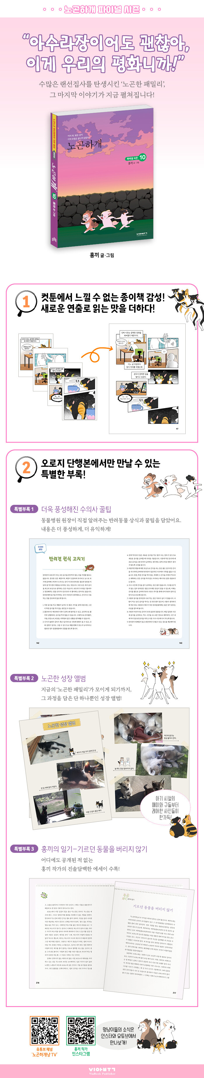 홍끼와 동물 가족들의 다사다난 코믹 일상 웹툰 '노곤하개' 파이널 시즌. 오직 단행본에서만 만나볼 수 있는 부록을 풍성하게 담아내 한층 소장가치를 높였다. 문제 상황에 대처할 수 있도록 전문가의 친절한 조언을 담은 ‘수의사 꿀팁’ 코너도 더 자세하고 유익해졌다.