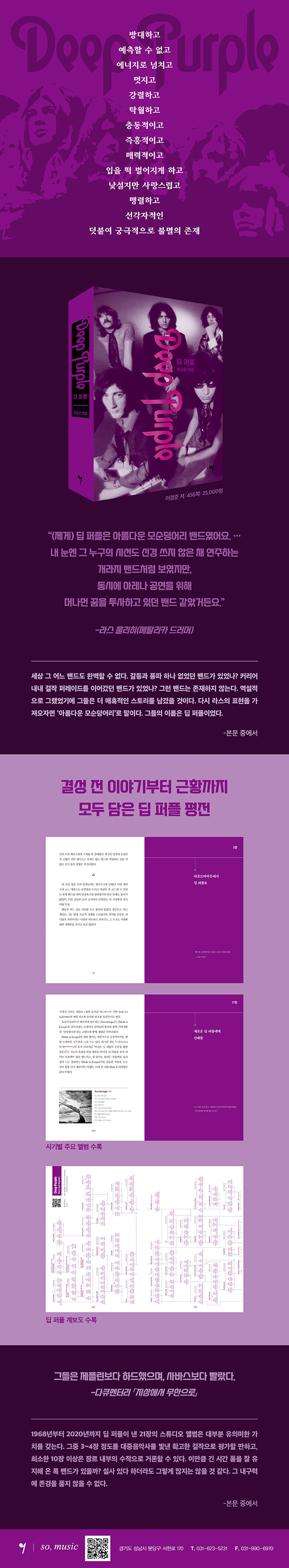 결성 전 이야기부터 최신 근황까지 모두 담은 딥 퍼플 평전. 라스 울리히의 표현처럼 ‘아름다운 모순덩어리’로 매혹적인 스토리를 남겨온 그들의 결성 전 이야기부터 최신 근황까지 그 기나긴 일대기를 되짚어본다.