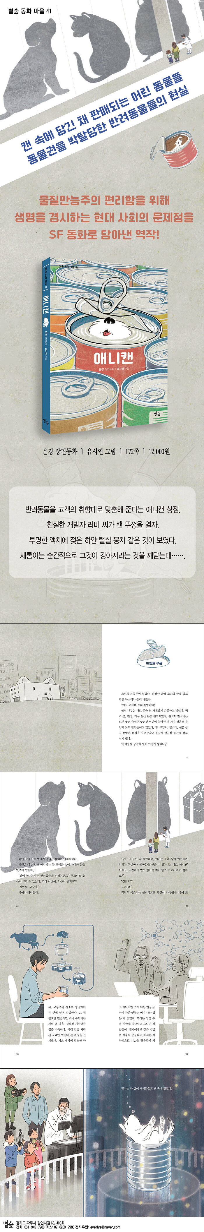 별숲 동화 마을 41권. 동면 기술과 특별한 먹이를 이용해 어린 반려동물을 알루미늄 캔에 담아 판매한다는 독특하고 흥미로운 설정으로 동물권 존중의 메시지를 담은 은경 동화작가의 SF 장편동화이다.