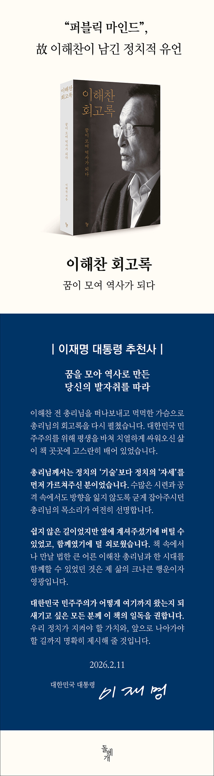 이해찬은 두 개의 꿈을 꾸었다. 이 꿈을 이루기 위해 좌고우면하지 않았고 선공후사의 삶을 살았다.