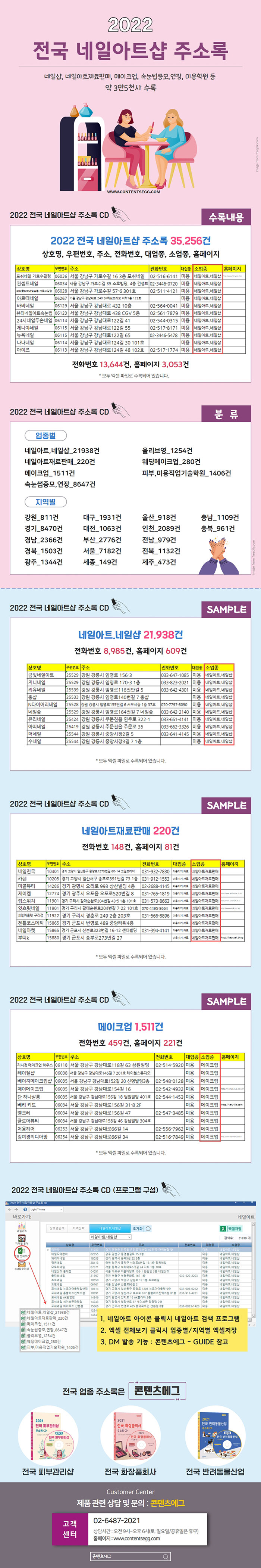 전국 네일샵, 네일아트재료판매, 메이크업, 속눈썹증모,연장, 미용학원 등 약 3만5천건 주소록이 수록되어 있다. 네일아트샵 주소록은 지역별, 업종별 엑셀 저장이 가능하다.