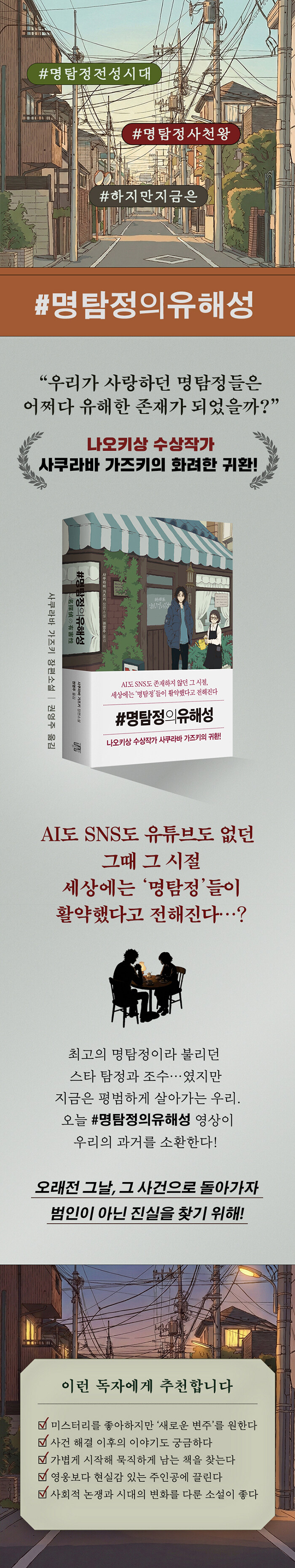 사쿠라바 가즈키의 <#명탐정의유해성>은 한때 정의였던 명탐정의 추리를 다시 묻는 소설이다. 해결 이후에 남는 책임과 상처를 추적하며, 미스터리의 통쾌함과 윤리적 질문을 동시에 제시한다.