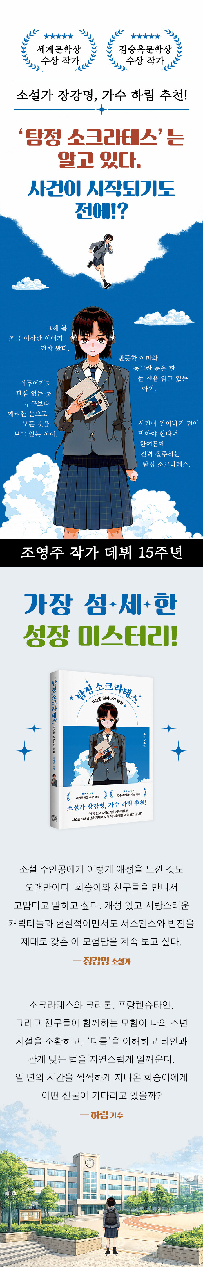화창한 봄날, 조금 이상한 아이가 전학 온다. 반듯한 이마에 동그란 눈을 한, 늘 책을 읽고 있는 아이. 아무에게도 관심 없는 것 같지만 누구보다 예리한 눈으로 모든 것을 보고 있는 아이…. 올해로 데뷔 15주년을 맞는 조영주의 신작 청소년 소설 《탐정 소크라테스》는 사건이 일어나기 전에 막기 위해 전력 질주하는 중학생 탐정 ‘희승’의 이야기이다.
