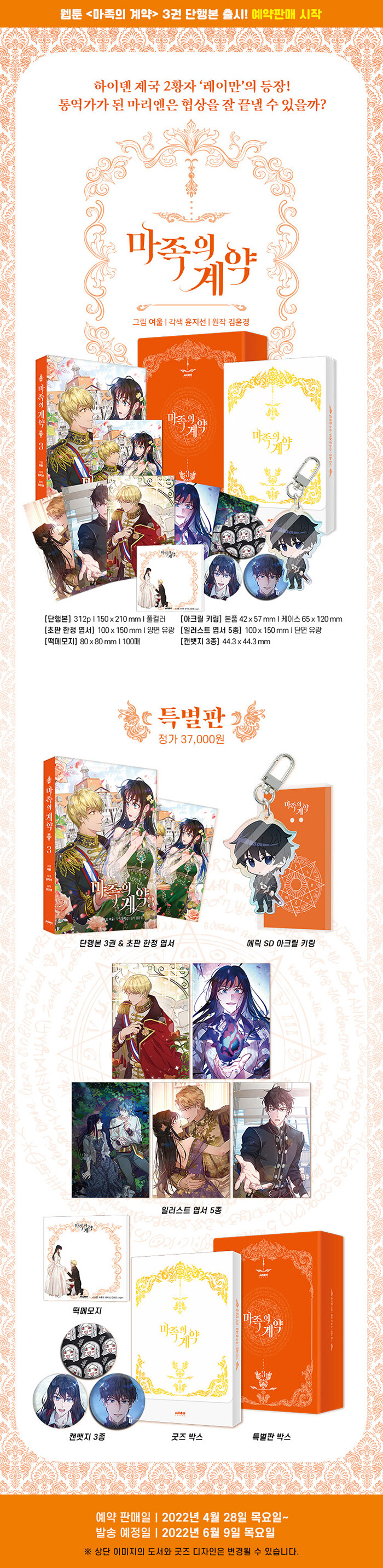 · 제목 : 마족의 계약 3 (엽서 1매 + 아크릴 키링 + 일러스트 엽서 5종 + 캔뱃지 3종 + 떡메모지 + 굿즈 패키징 + 박스 포함 특별판) (만화)
