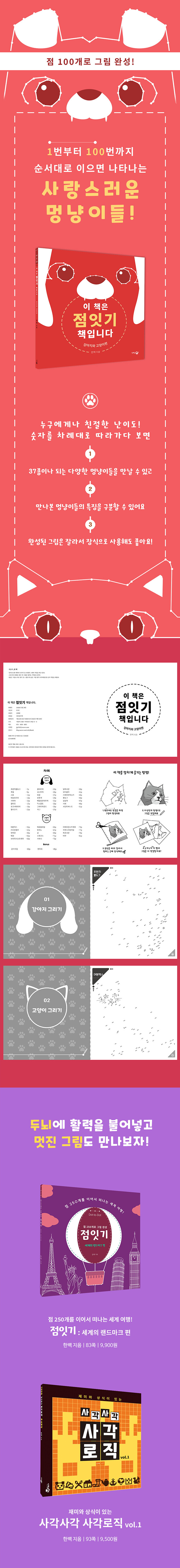점 100개를 연결해 강아지와 고양이 그림을 완성하는 점잇기 책이다. 번호대로 잇고 색칠하며 집중력과 관찰력을 기를 수 있고, 완성 작품은 장식으로도 활용 가능하다. 아이와 어른이 함께 즐기기 좋다.