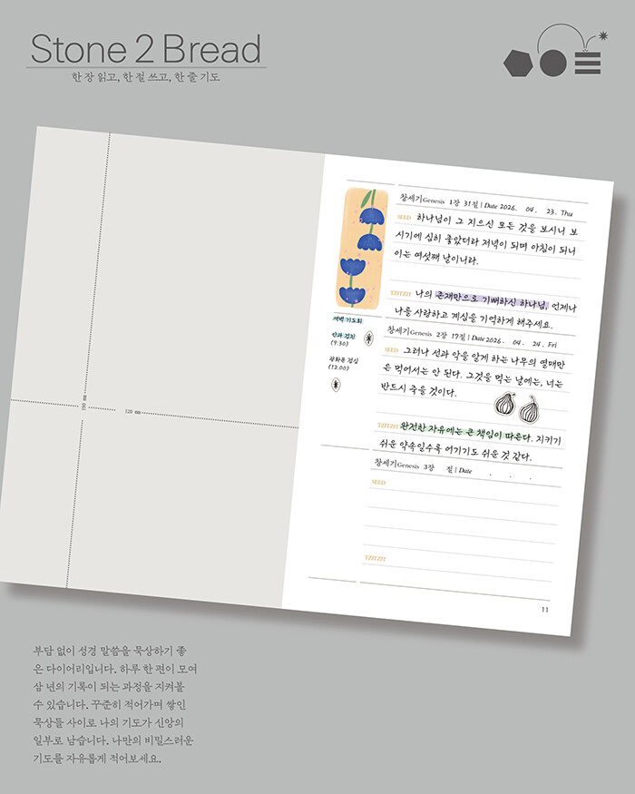 돌빵은 창세기 1장부터 요한계시록 22장까지 신구약 1189장의 말씀을 읽어 가며 매 장마다 말씀 한 구절과 기도 한 줄을 기록하도록 돕는 묵상의 도구입니다. 말씀을 기록하고 말씀으로 기도하는 묵상 다이어리입니다.