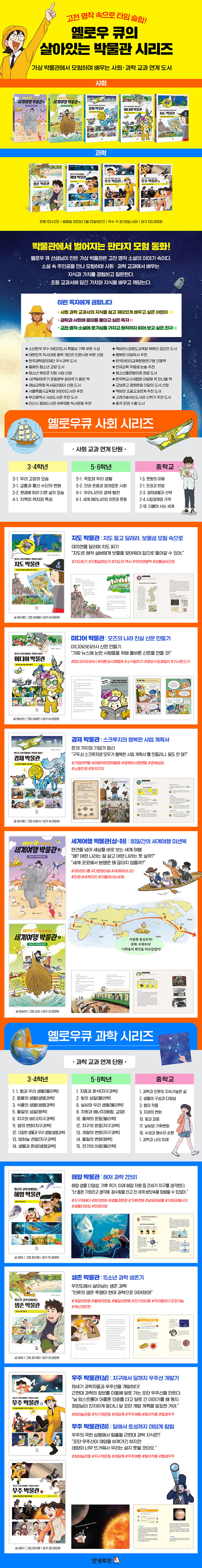 박물관에 간 어린이들이 괴짜 선생님 '옐로우 큐'를 만나 고전 명작 소설 속 가상의 세계에서 겪는 모험을 그린다. 이 과정에서 초등 교과서에 담긴 가치와 지식을 직접 체험하며 배우고, 스스로 깨닫게 된다. 각 권에는 이야기에 등장했던 정보와 지식을 각 장마다 알기 쉽게 정리하여 어린이들의 이해를 돕도록 구성했다.