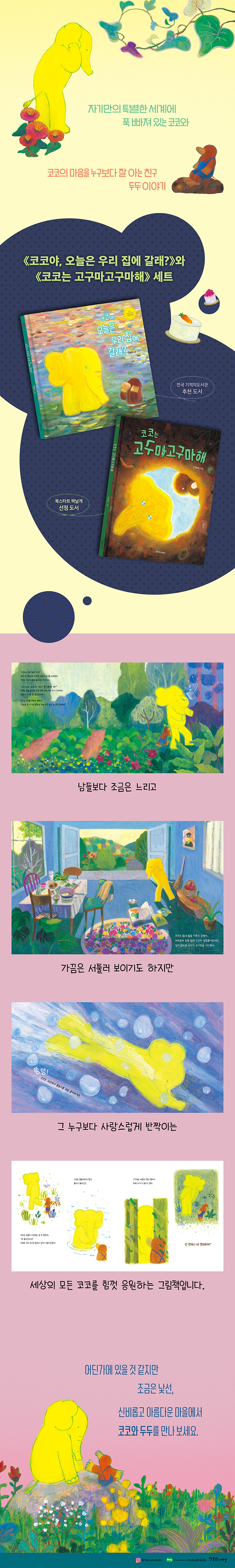 자기만의 세계에 빠져 있는 코코와 그런 코코를 누구보다 잘 아는 친구 두두 이야기, 《코코야, 오늘은 우리 집에 갈래?》와 《코코는 고구마고구마해》를 세트로 만나 보자. 남들보다 조금 느리고 서툴지만 누구보다 사랑스러운, 세상의 모든 '코코'를 응원하는 그림책이다.