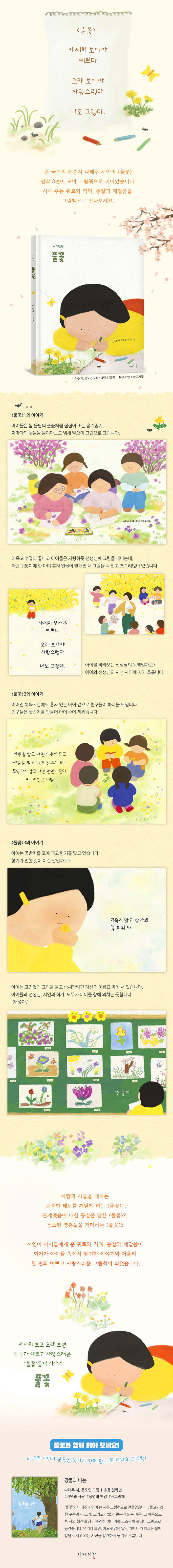 시인이 아이들에게 준 위로와 격려, 통찰과 깨달음이 화가가 아이들 속에서 발견한 이야기와 어울려 한 편의 예쁘고 사랑스러운 그림책이 되었습니다. 추위와 바람을 이겨내고 올망졸망 피어나는 풀꽃들처럼, 꼭 풀꽃 같은 아이들처럼. 시와 이야기와 그림책, 그 향기 그 빛깔이 있어 살 만한 세상입니다.
