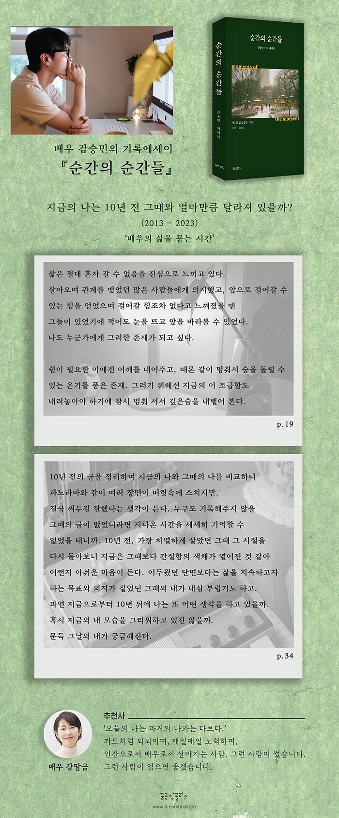 그렇게 형과의 대화를 끝으로 무언가에 이끌리듯 노트북 앞에 앉아 시간의 흐름도 알아채지 못한 채 첫 번째 글을 써 내려갔다. 그 후로 떠오르는 주제나 생각들을 이면지나 메모장에 기록하였고 잠드는 순간까지도 계속해서 이야기의 소재들이 아른거려 늦은 시간까지 잠 못 들었던 적이 수차례. 난 그만큼 글쓰기에 깊이 빠져들었고 글 쓰는 순간만큼은 진심으로 행복하다고 생각했다. 하지만 안타깝게도 나는 내 성격을 알고 있다. 쉽게 빠져들면 그보다 더 쉽게 질려한다는 것을. 앞으로 나는 얼마만큼의 글을 더 쓸 수 있을까? 그럼에도 불구하고 도전해 보려고 한다. 서른이란 나이. 책임감에서 자유로울 수 없는 나. 하지만 ‘새로운 일을 두려워하지 않는’이란 구절을 더하여 무엇이든 책임감 있게 도전해 보고 싶다. 현재에도 난 줄기차게 배우로서 도전하고 있지 않은가. 걱정은 땅속 깊은 곳에 묻어버리고 그간의 배우 생활을 하며 겪어왔던 이야기들을 담담하게 풀어 내보려 한다.