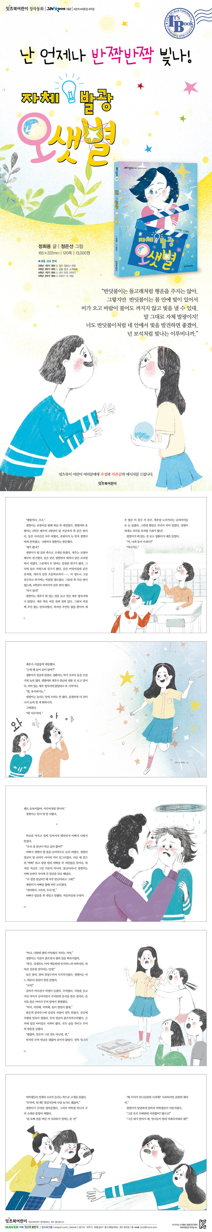다른 친구들과 비교하며 여러 가지로 부족한 것 같은 자기 모습에 낙담할 때가 있습니다. 정희용 작가는 ‘비교’는 내가 가진 것보다 내게 없는 것에 집중하게 한다고 말합니다. 우리 모두는 저마다 멋진 장점을 가지고 있는데 정작 자신은 그걸 잘 모른다면 행복할 수 없을 거예요. 『자체 발광 오샛별』은 우리 어린이들 자신이 얼마나 소중하고 가치 있는 존재인지 느끼기 바라는 마음을 담고 있습니다. 주인공 샛별이는 평소에 반 아이들의 주목을 받는 게 좋습니다. 그런데 어느 날 아역 탤런트 루비가 전학을 오자, 아이들의 관심은 온통 루비에게 쏠립니다. 아이들의 관심을 모조리 빼앗긴 것 같은 샛별이. 루비와 자신을 비교하며 자신이 너무나 초라하다고 생각합니다. 그런데 루비가 다른 아이들의 시선에 신경을 쓰느라 전전긍긍하면서 정작 자신의 마음은 돌보지 못하는 모습을 보면서 여러 가지 생각을 합니다. 독자 어린이들이 『자체 발광 오샛별』을 읽고 우리는 모두 세상에 하나뿐인 ‘나’로서 빛나고 있다는 것을 알기 바랍니다.
