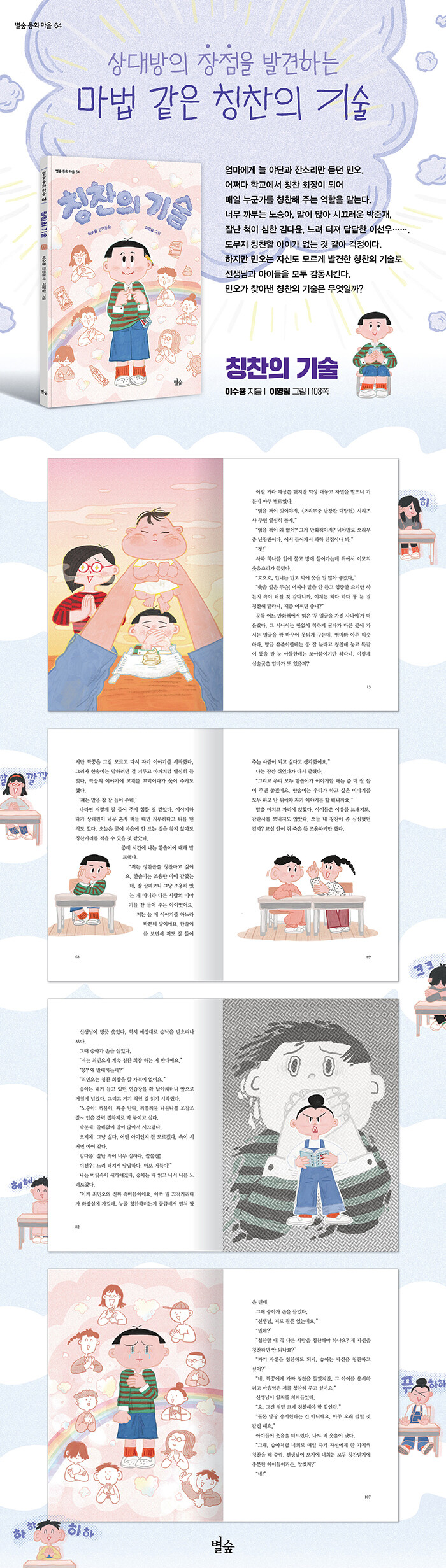 칭찬은 가장 간단하지만 강력한 힘을 가진 언어다. 《칭찬의 기술》은 칭찬이 얼마나 사람을 변화시키는지를 따뜻한 시선으로 그린 이수용 작가의 동화다. 주인공 민오는 엄마의 잔소리에 익숙한 아이였지만, ‘칭찬 회장’이 된 후 반 친구들의 장점을 찾아내며 세상을 다르게 보기 시작한다.