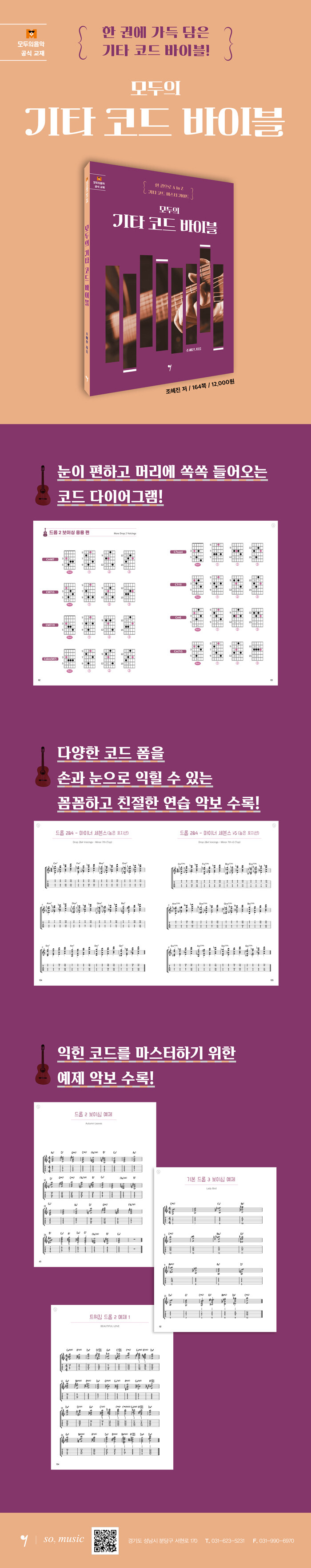 기본 3화음, 오픈 코드부터 드롭 2, 드롭 3, 서스펜디드, 인터벌 보이싱 등 실전 연주 시 활용도가 높은 코드 보이싱까지 기타 코드의 모든 것을 부족함 없이 담은, 말 그대로 기타 코드의 '바이블'이다.