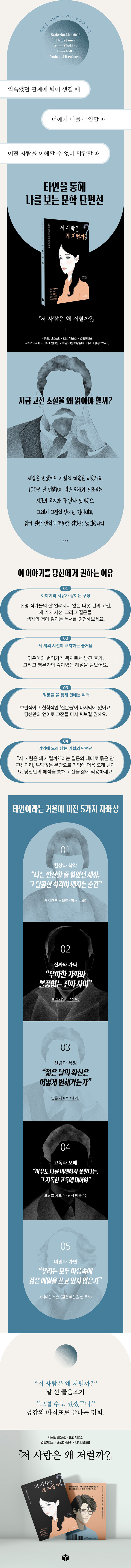 도무지 이해할 수 없는 타인의 말과 행동 앞에서 떠오르는 질문에서 출발한다. 서로 다른 배경의 고전 단편 다섯 편을 한 권으로 엮어, 간결한 플롯과 날카로운 통찰을 통해 ‘이해할 수 없는 타인’에서 ‘나 자신’의 내면으로 시선을 옮긴다.