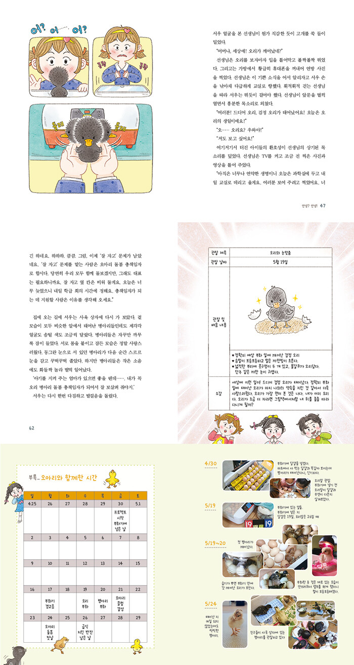 “오늘도 역시 채원이, 정답! 생명을 존중한다는 것이 어떤 것인지 글자로 배우지 않고 생활 속에서 배우고 싶었어요. 가축. 즉, 인간이 길들여 함께 살게 된 동물과 살아 보면서요. 그러면 아무래도 더 생각할 거리가 많겠죠? 그리고 무엇보다, 귀엽잖아요! 하하하. 사실 선생님도 알 부화는 처음이라서 여러분 못지않게 떨리고 설렙니다. 우리 잘해 봐요!”