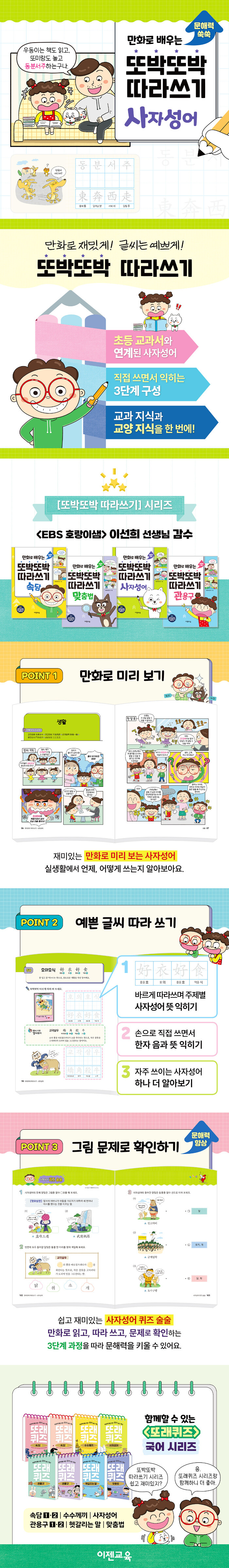 문해력이 우리 아이의 성적을 좌우한다. <또박또박 따라쓰기> 시리즈는 속담, 맞춤법, 관용구, 사자성어로 이루어진 책이다. 교과서나 실생활에서 자주 볼 수 있는 사자성어를 읽고 써 보면서 놀이하듯 재미있게 문해력을 키울 수 있다.